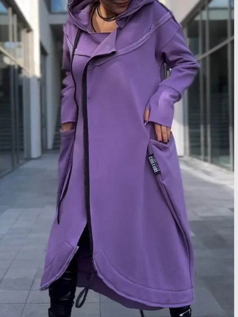 Made from lightweight, breathable fabric with a soft, warming touch, Evelisse wraps you in all-day comfort. Its long, flattering cut and asymmetrical hem elongate the figure, while the front zip adds ease and a hint of modern flair. Perfect for layering over jeans or leggings, or wearing on its own as a casual dress, this hoodie adapts gracefully to your lifestyle. Timeless, practical, and chic—it’s the piece your wardrobe has been waiting for.